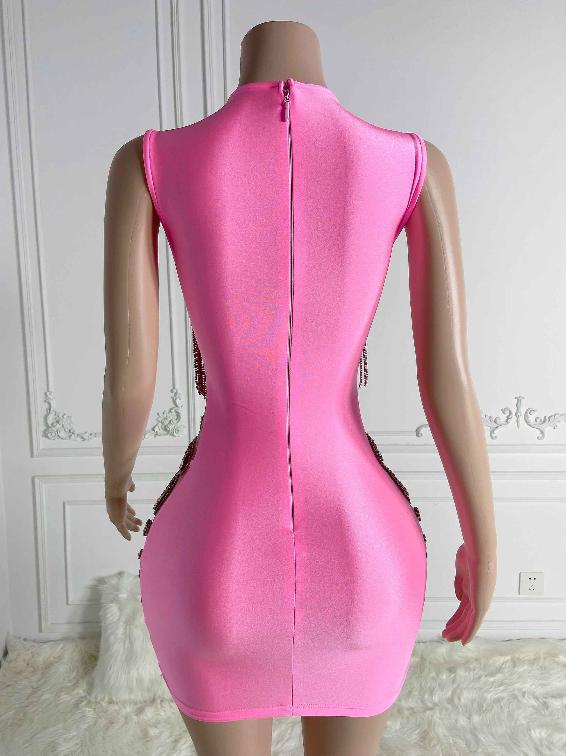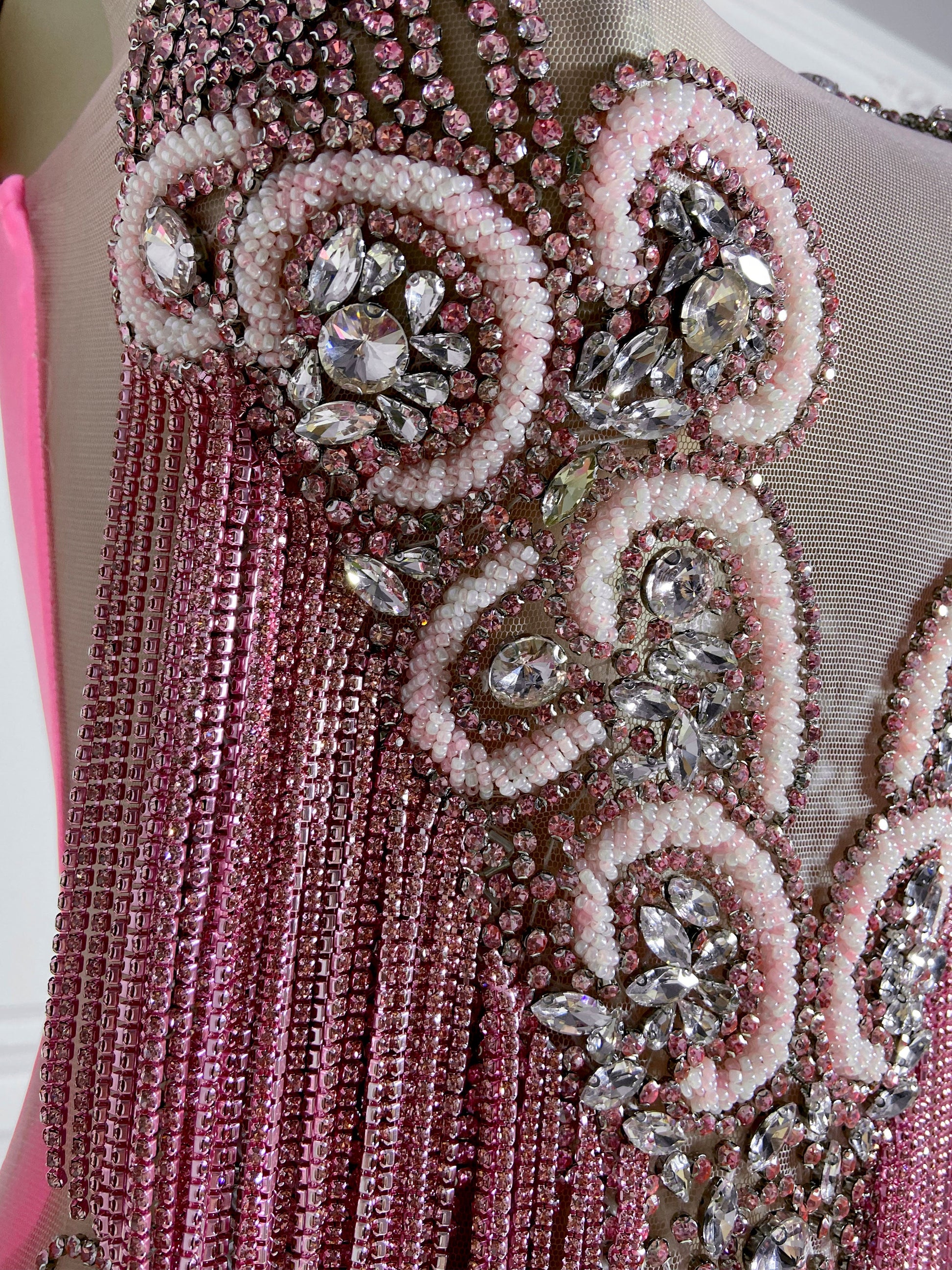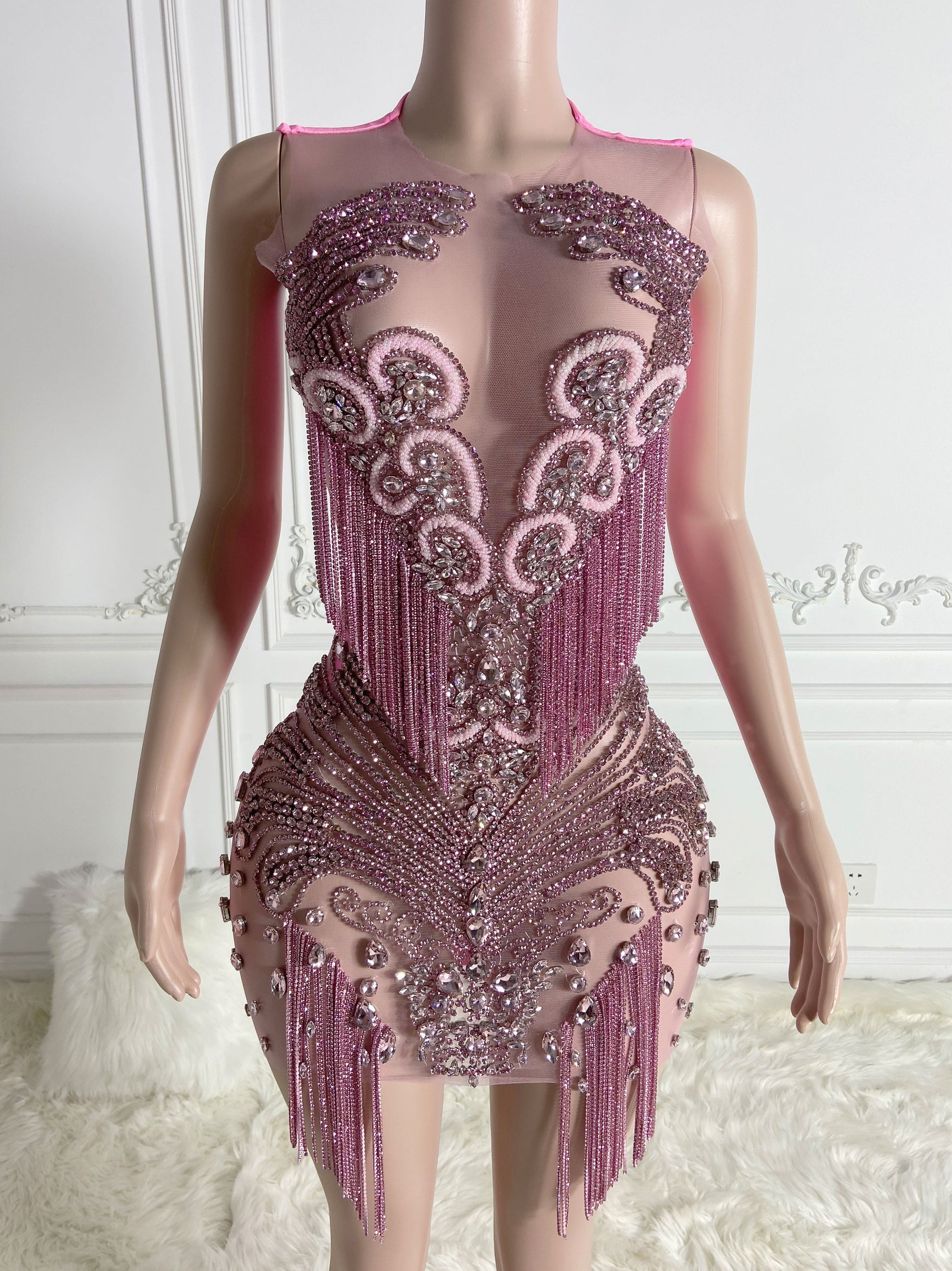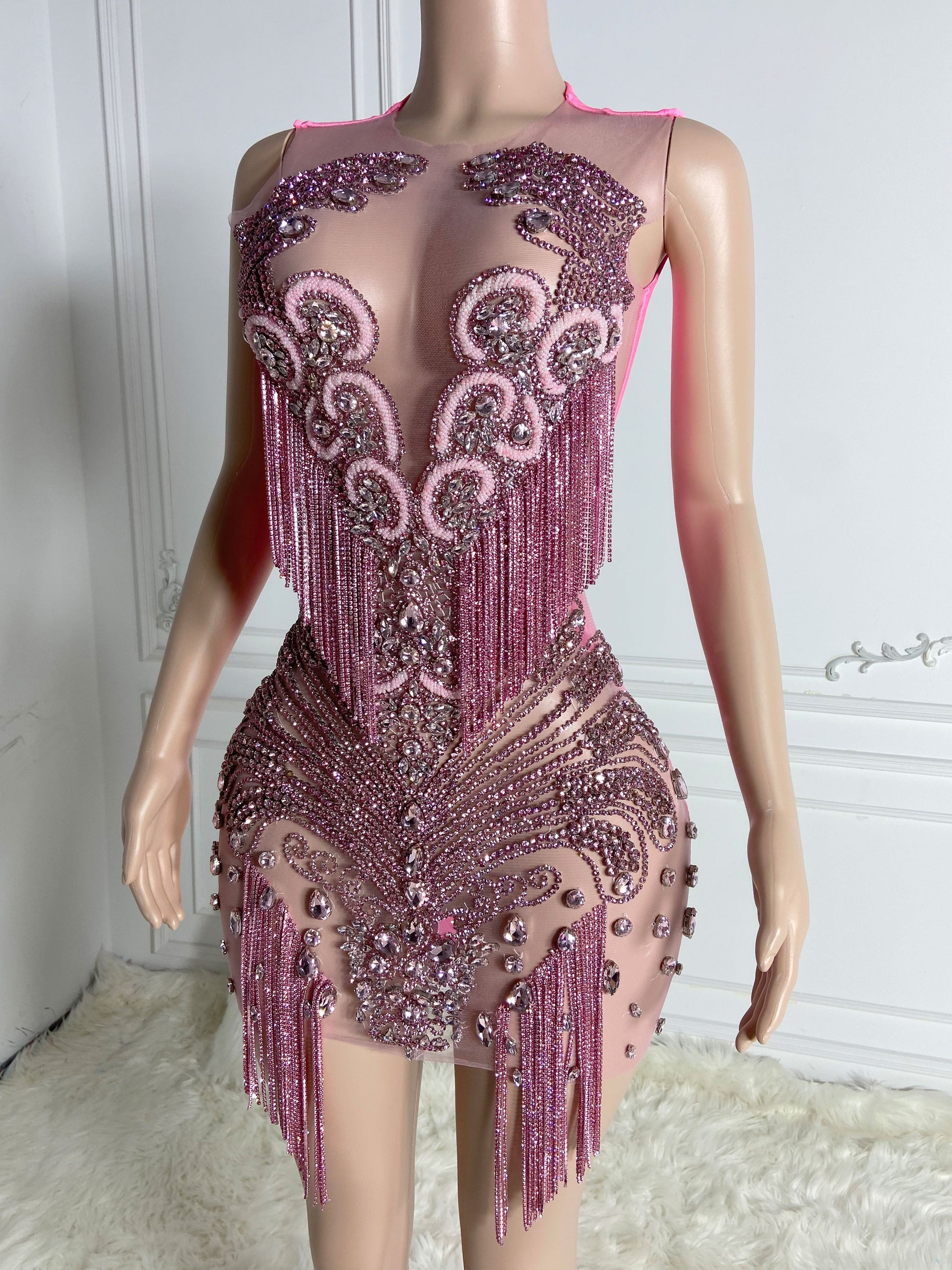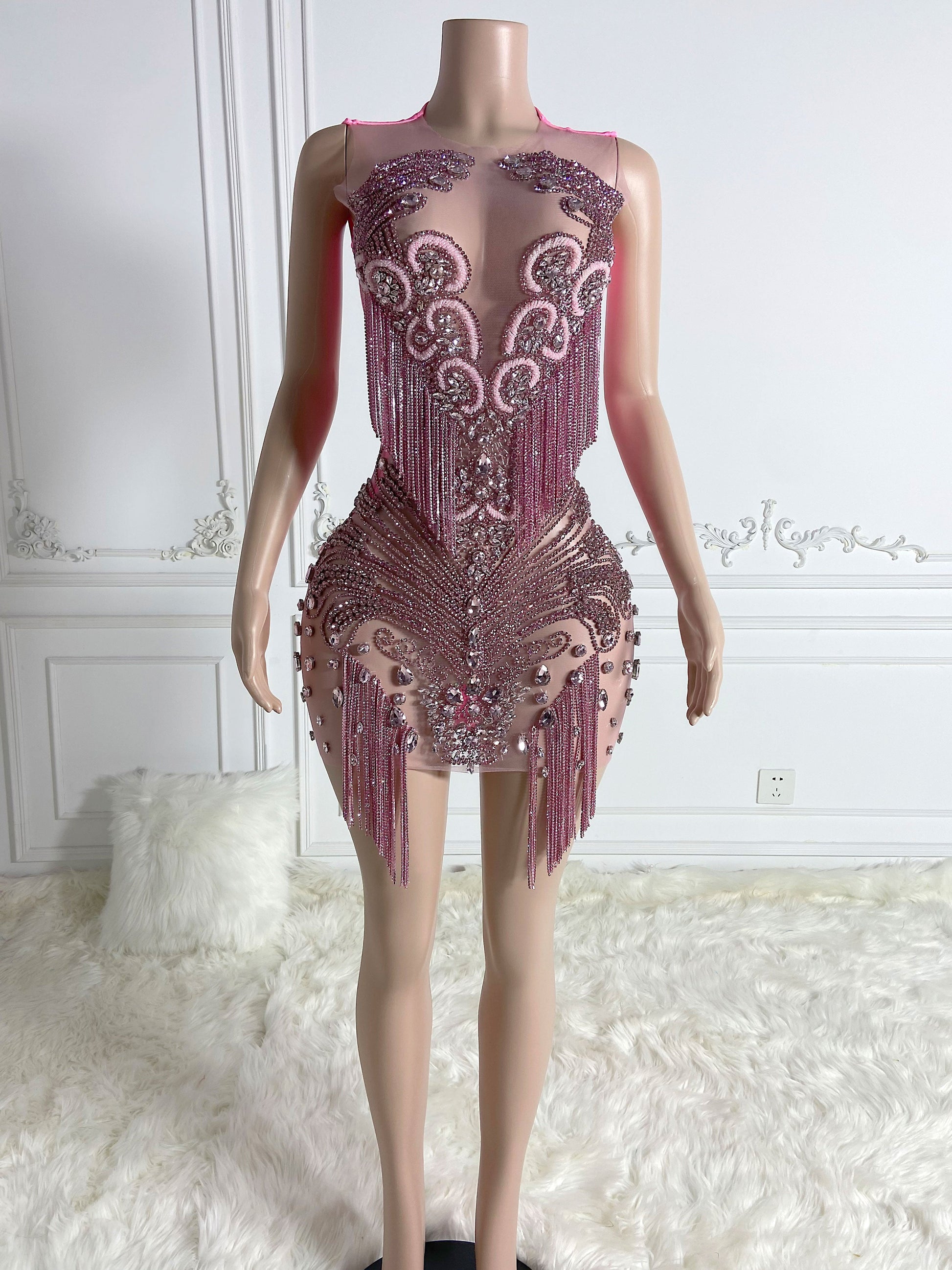 The Azura-Rose Crystal Dress is the epitome of opulence and sophistication. Featuring dazzling rhinestone embellishments and luxurious feather details, this masterpiece is designed to captivate. With a sculpted silhouette and impeccable detailing, it’s perfect for making a statement at your most glamorous celebrations.